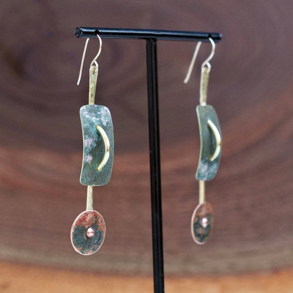 - Artfully designed sculptural statement earrings with brass and copper patina. Inspired by the desert colors and landscape from a recent visit to Joshua Tree.