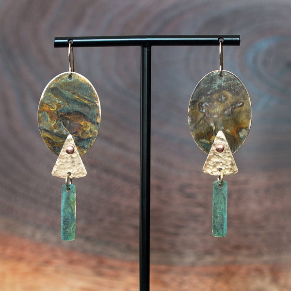 - Artfully designed statement earrings made with brass patina, hammered brass and copper rivets.