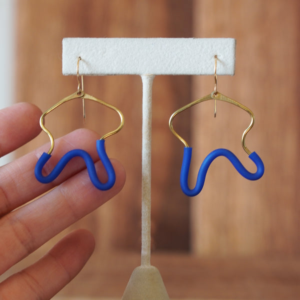 - Artfully designed brass wire and blue rubber tubing statement earrings.