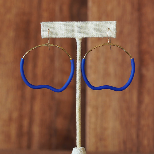 - Artfully designed brass wire and blue rubber tubing statement earrings.
