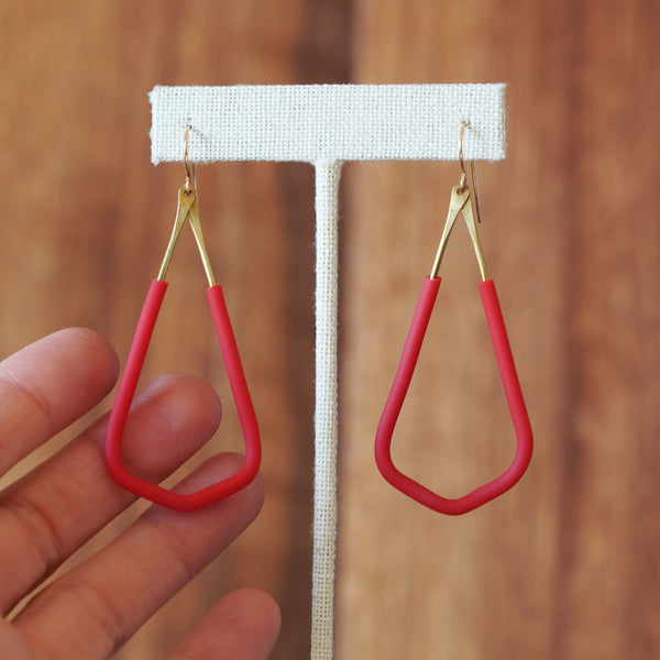- Artfully designed brass wire and red rubber tubing statement earrings.
